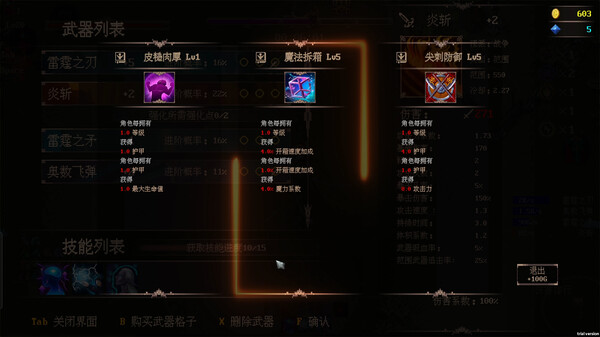 升级可以获得强化点强化武器,有概率获得武器特效,形成构筑的关键。根据特效,选择更适合的技能和宝物。有些武器的特效可以与其他武器产生联动,有些可以根据属性强化武器自身,有些可以增加角色属性。
