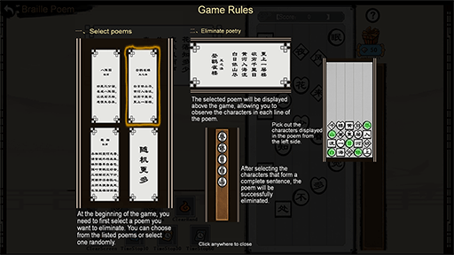 游戏开始后,需要先观测上方您所选的诗词中每一诗句(竖排)的文字有哪些,然后在下方的文字区域中点选出任意一句诗句所包含的全部文字。