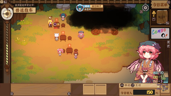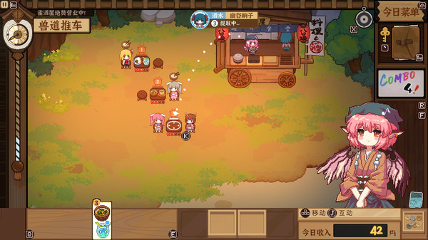 你扮演移动烧烤屋的老板娘米斯蒂娅,白天去幻想乡的各处收集食材,研究可口的料理;收集或购买酒水,给客人们增加就餐的体验。总而言之,这里没有战斗,没有弹幕,只有客人,和为了满足客人的高情商厨娘米斯蒂娅!