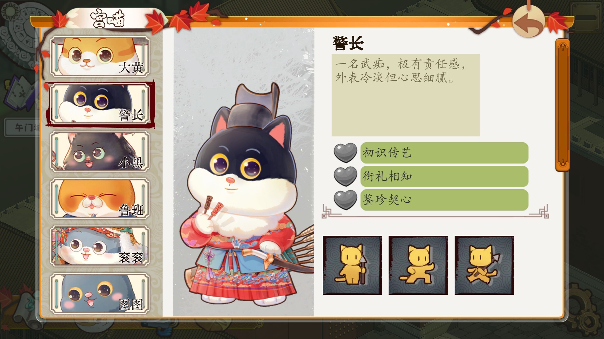 宫喵原型: 游戏内的NPC均取自故宫真实存在的猫。你将在这里结识威严的“鳌拜”、机灵的“警长”和憨厚的“馒头”等。