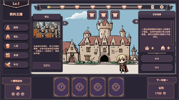 亲爱的王子公主殿下,一个传奇般的王国正等待您来继承,您的人民们正在心怀期待地等待着您,渴望您的智慧与勇气,但这并非一帆风顺之旅,困难与挑战将不可避免地出现在前行的道路上,不要辜负人民对您的信任,快来带领他们走向伟大吧~