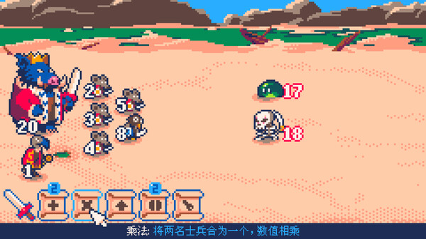 《超级代数大战》是一款轻量级的战术解谜RPG游戏,你将控制一位拥有数学魔法之力的野猪国王!国王可以将自己的动物下属们进行加法和乘法等运算,