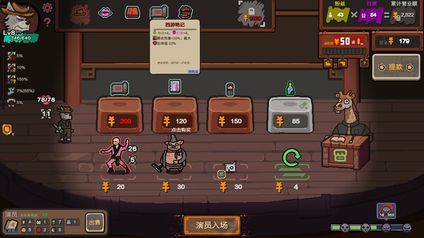 演员分为“善”“恶”两类。你不仅要招募“善”演员作为帮手,也要招募“恶”演员充当沙包。合理选择你的反派,作为主演可不能输!你将一路过关斩将,收获粉丝打赏,达成完美演出。